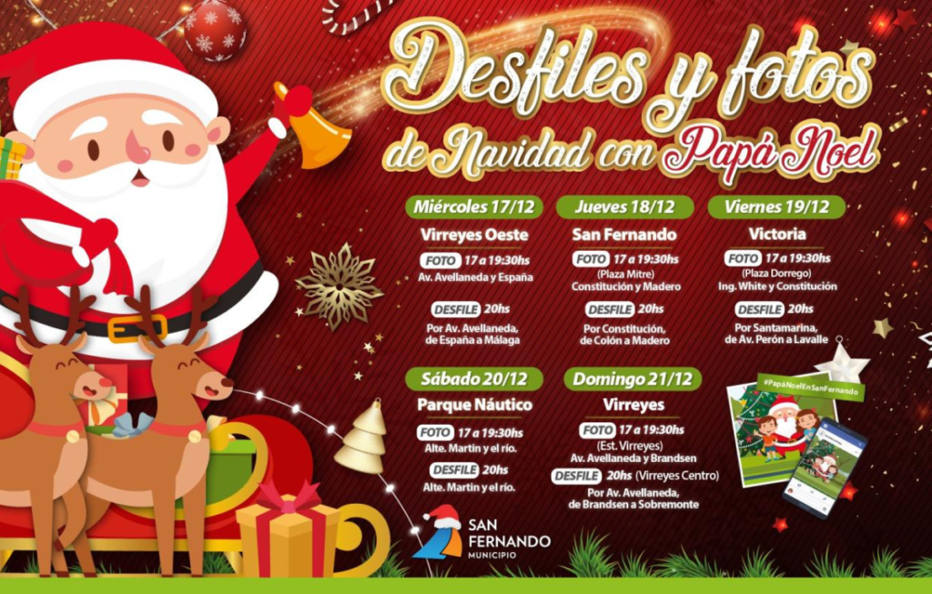 San Fernando nuevamente espera la una de las épocas más lindas del año con sus espacios públicos y centros comerciales decorados para la Navidad, con la ilusión de recibir a Papá Noel y sus amigos, con espectáculos de participación libre y gratuita. Ellos se tomarán fotos instantáneas de 17 a 19.30h y desde las 20h presentarán su desfile, durante cinco días en distintos puntos de la ciudad.